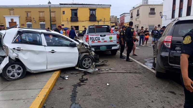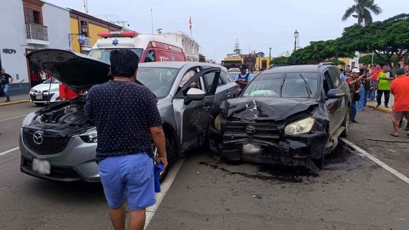 Un accidente de tránsito múltiple se registró en el perímetro de la Plaza de Armas de Trujillo. Cuatro vehículos estuvieron involucrados en el choque, entre ellos una camioneta del Escuadrón de Emergencia de la Policía Nacional del Perú (PNP).
