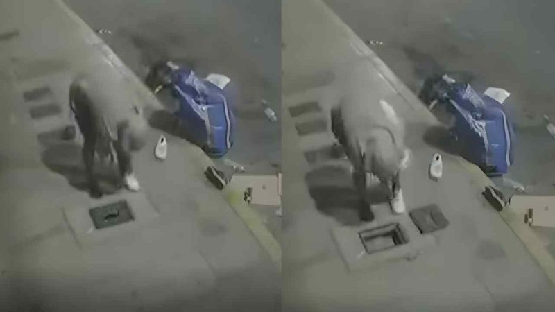 Aprovechando ese momento, el sujeto se agacha en dos ocasiones y logra retirar la tapa de un buzón de agua. Luego, continúa con su accionar delictivo sin levantar sospechas inmediatas.