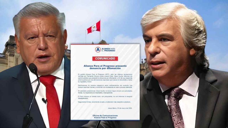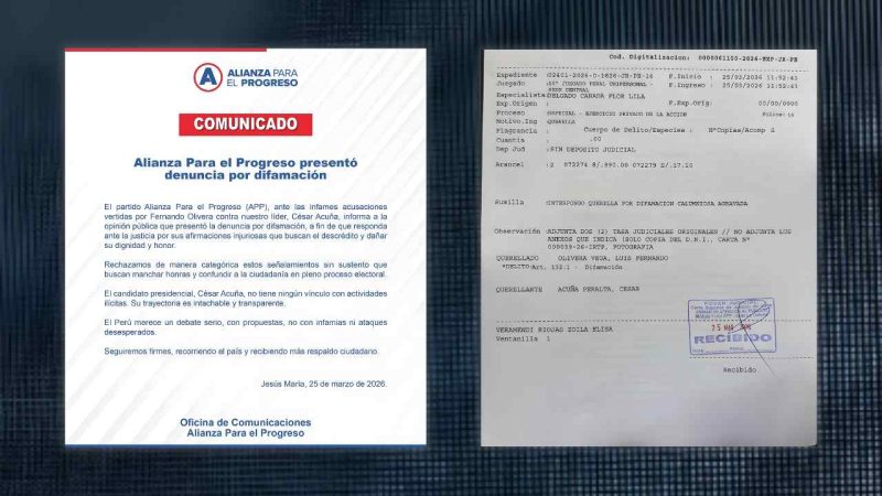 El partido Alianza Para el Progreso (APP) informó que presentó una denuncia por difamación contra Fernando Olivera, luego de las acusaciones realizadas contra su líder, César Acuña. La organización señaló que busca que el caso sea evaluado por la justicia.