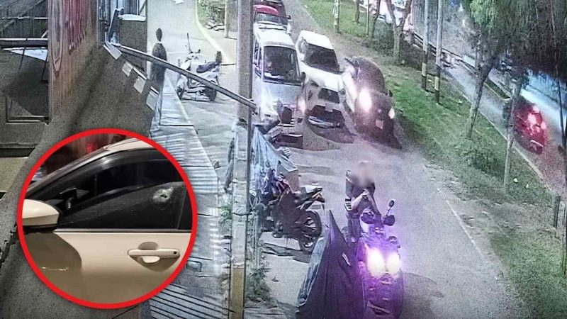 Las cámaras de seguridad captaron el instante en que una camioneta blanca se estaciona en la zona. Segundos después, un auto negro pasa por el lugar y, desde su interior, realizan hasta cinco disparos que impactan contra la luna del conductor.